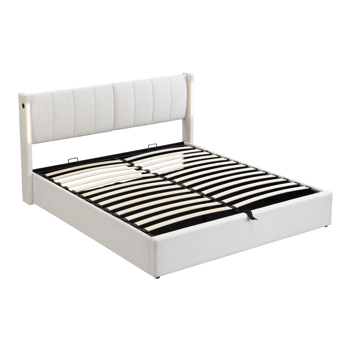 Weißes PU-Doppelbett mit Stauraum, LED-Beleuchtung, USB und verstellbarem Kopfteil (160 x 200 cm) UDET WHITE KING
