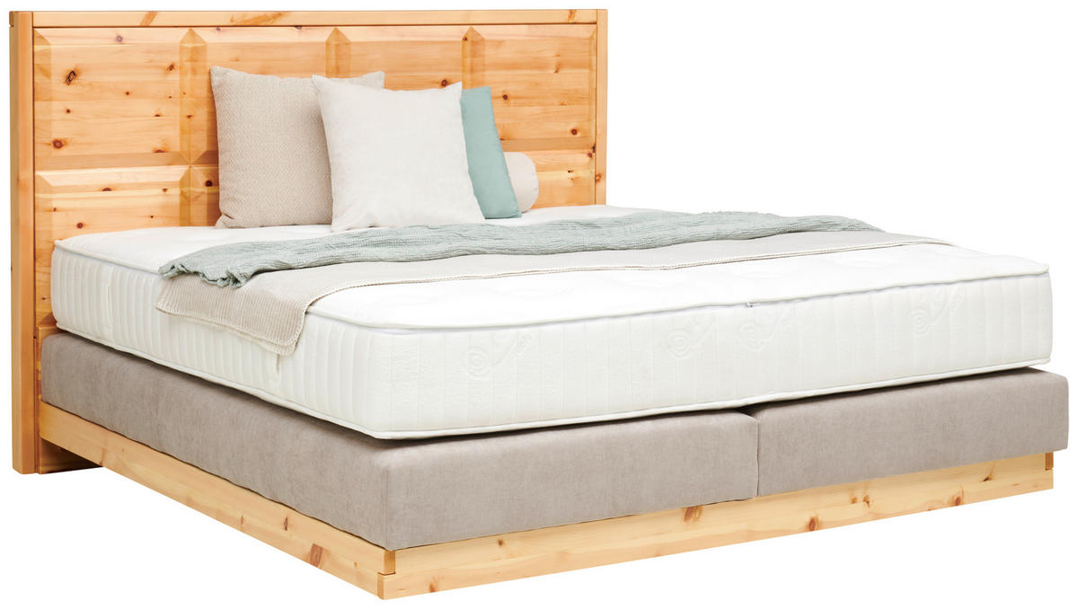 "Einfach zurücklehnen und ausspannen" lautet das Motto mit dem Kopfteil. Relax-Mood: Entdecken Sie, wie sich erholsamer Schlaf wirklich anfühlt, mit diesem Boxspringbett (ca. 160 x 200 cm) in Zirbelkieferfarben sowie Greige inklusive Matratze, Topper und Holz-Kopfteil!