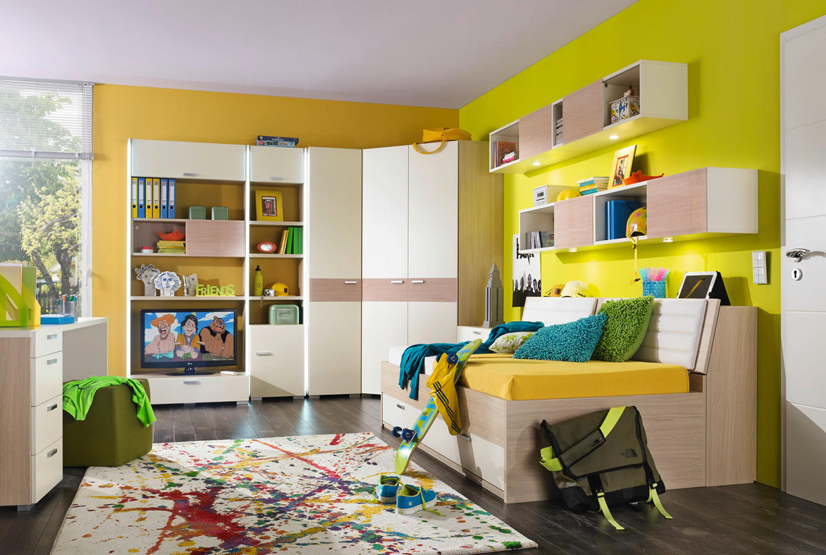 In diesem geschmackvoll gestalteten Jugendzimmer kann sich Ihr Sohn oder Ihre Tochter so richtig austoben. Damit es auf dessen Hobbys und Bedürfnisse abgestimmt werden kann, haben Sie die Möglichkeit das Zimmer individuell einzurichten. Wählen Sie aus verschiedenen Varianten und Farben Ihre liebste aus. So stimmen Sie die Einrichtung ideal auf das gegebene Raumangebot ab. Alle Möbel sind aus einer Kombination aus hochwertigen Holzwerkstoffen gefertigt und somit besonders pflegeleicht und robust. Das gelungene Zusammenspiel aus matten und hochglänzenden Oberflächen in Cremeweiß und natürlichen Holzfarben verleiht dem Design eine äußerst abwechslungsreiche Optik. Elegante Elemente aus klarem Glas veredeln das ansprechende Gesamtbild.