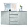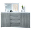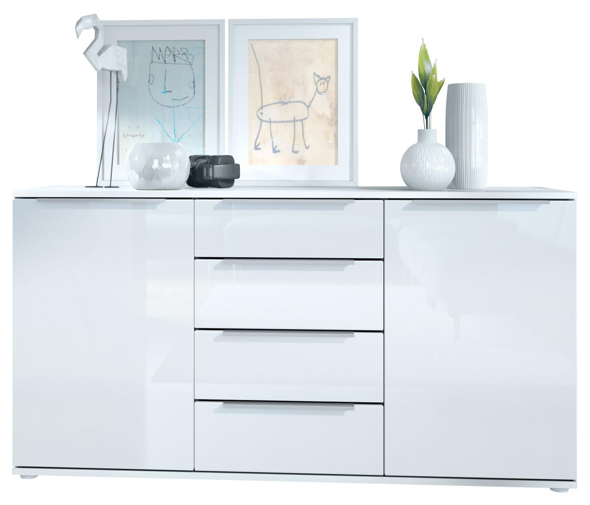 Modern, praktisch und hübsch: Sowohl die 4 Schubladen als auch die zwei Türen des Linio Sideboards sind mit 30 cm langen silbergrauen Winkelgriffen aus Metall verziert.