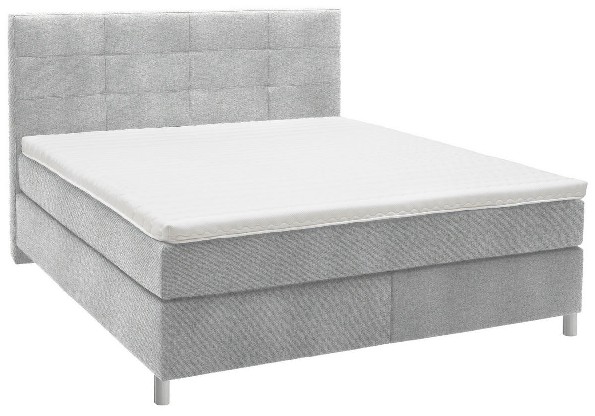 Chromfarben ist ein fester Stand gegeben und das Design wird adäquat vervollständigt. Realisieren Sie ein kuscheliges Schlafzimmer-Upgrade mit diesem Boxspringbett (ca. 180 x 200 cm) in Hellgrau inklusive Matratze, Topper und gepolstertem Kopfteil – weil Qualität und Ästhetik keine Kompromisse brauchen!