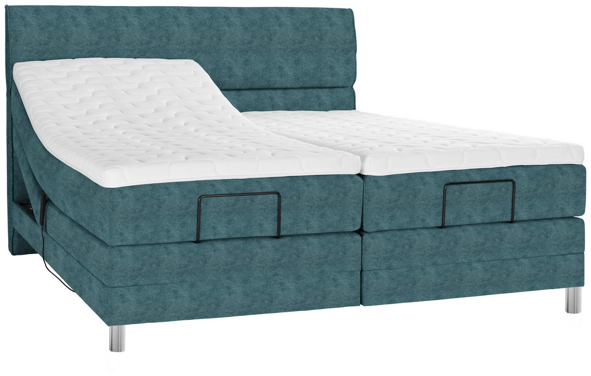 Chromfarben. Wunderbar behaglich, eindrucksvoll im Design – dieses Boxspringbett (ca. 200 x 200 cm) in Blau mit Matratze, Topper,