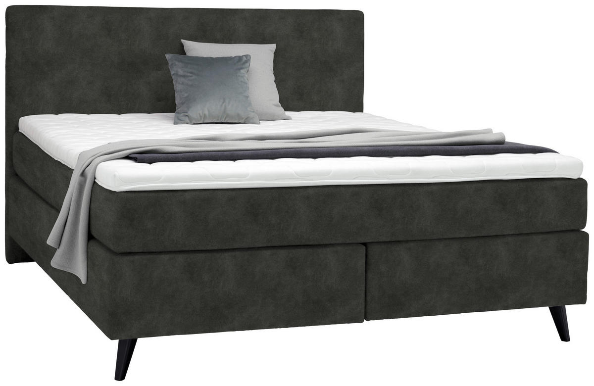 Schwarz ist ein sicherer Stand gegeben und das Design wird stimmig vervollständigt. Relax-Mode on: Entdecken Sie, wie sich erholsamer Schlaf wirklich anfühlt, mit diesem Boxspringbett (ca. 200 x 200 cm) in Dunkelgrau inklusive Matratzen, Topper und gepolstertem Kopfteil!