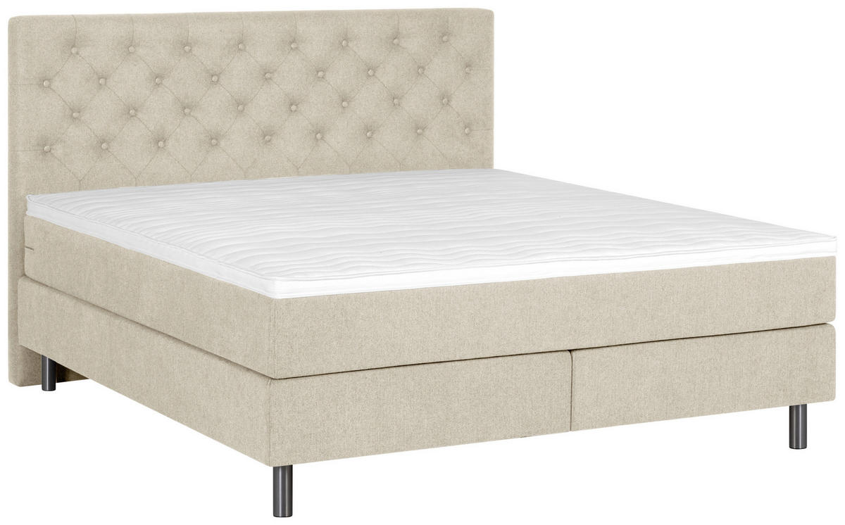 Silberfarben werten das Design stylish auf und schaffen offene Bodenfreiheit. Mehr als Schlaf: Ihr neues Boxspringbett (ca. 160 x 200 cm) in Beige mit Matratze, Topper und gepolstertem Kopfteil für ultimative Relaxqualität!
