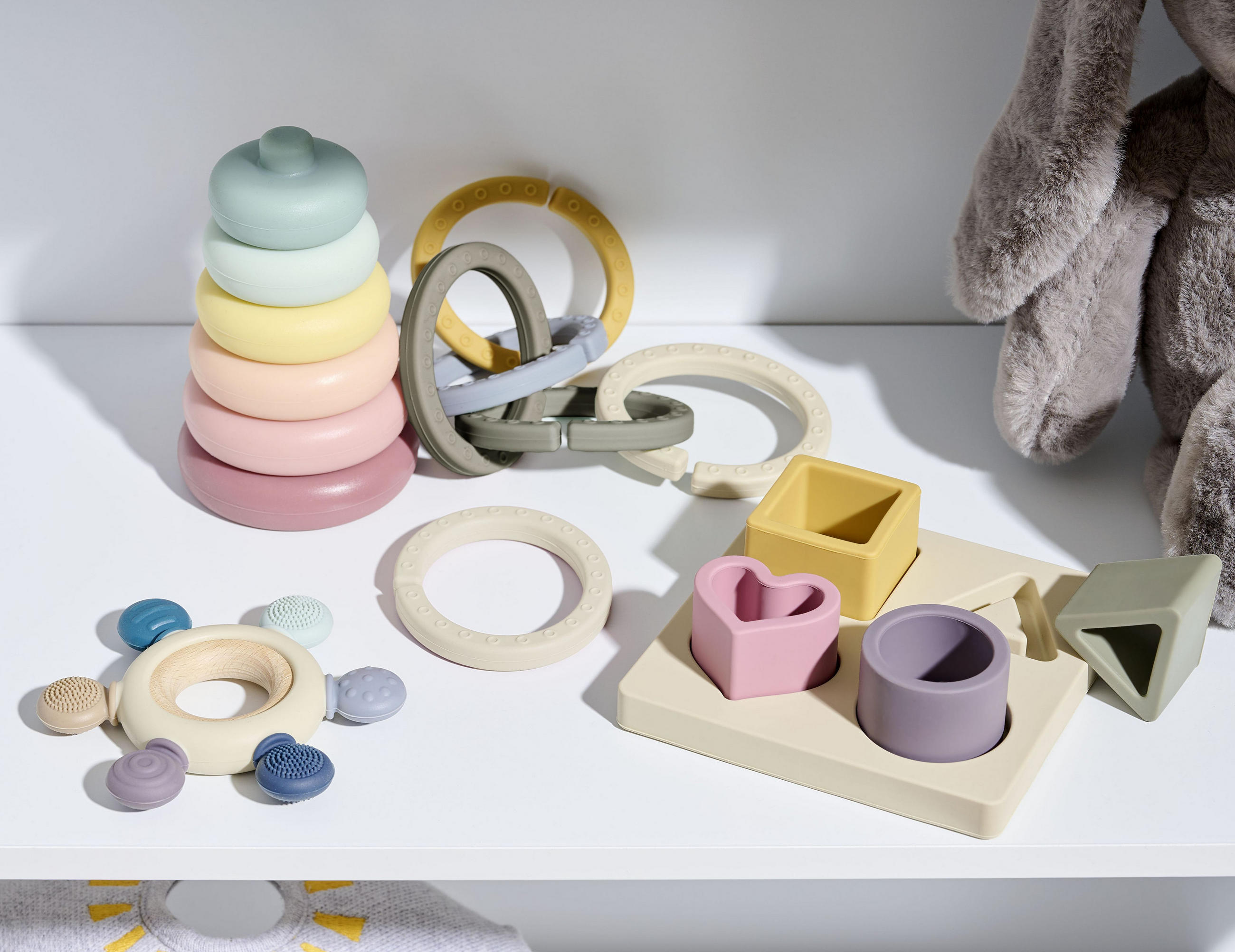 - Schon bei den Kleinsten hoch im Kurs steht Babyspielzeug, das die Wahrnehmung und den Tastsinn fördert – von der Rassel bis zum Spielbogen.