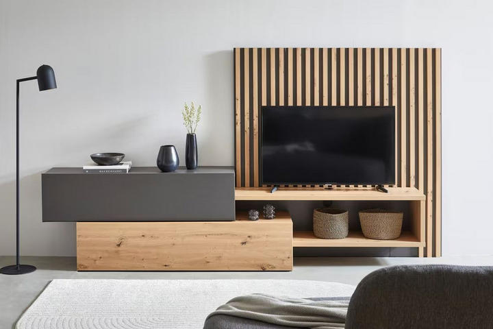 Ein fast genauso relevantes Kriterium, wenn Sie Ihr Wohnzimmer einrichten, ist allerdings der Stauraum. Vor allem in großen Familien und kleinen Wohnsituationen kann man gar nicht genug Platz für Bücher, Deko und vieles mehr haben. Moderne Wohnwände sind dafür eine ebenso praktische wie optisch ansprechende Lösung. Kombiniert man die Stauraumwunder noch mit klassischen Regalen oder beispielsweise Raumteilern, finden bestimmt auch jeder Blumentopf, jede Vase und jeder Bilderrahmen ein Zuhause.